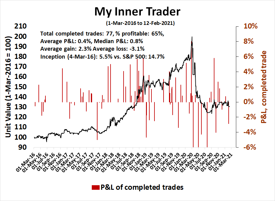 My inner trader uses a trading model, which is a blend of price momentum (is the Trend Model becoming more bullish, or bearish?) and overbought/oversold extremes (don’t buy if the trend is overbought, and vice versa). Subscribers receive real-time alerts of model changes, and a hypothetical trading record of the email alerts are updated weekly