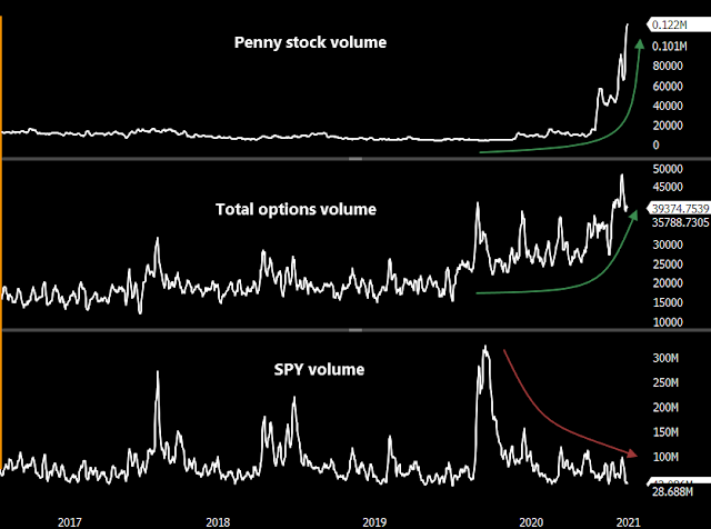 In addition, the surge in penny stock and option trading volume along with a collapse in SPY volume has a bubbly feel of a stampede of inexperienced small retail traders. One investment professional