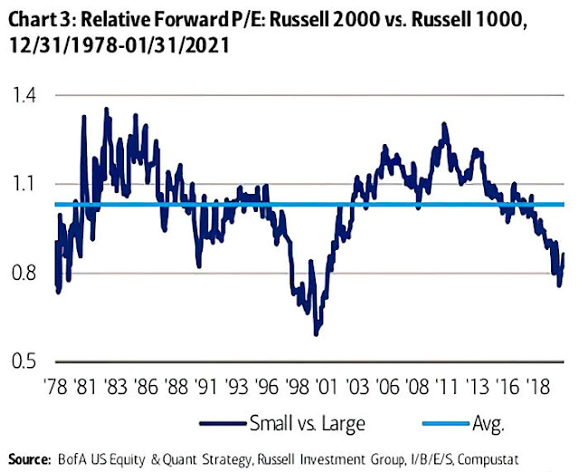 If you are talking about small caps, the valuation of mid and small caps are less demanding than large caps. See Yardeni’s analysis, figures 16 and 17.