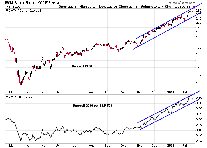 Mid-week market update: Instead of repeating endlessly the mantra of how frothy this market has become, I thought it would be worthwhile to take a look at one of the market leaders. Small cap stocks have led the market up during this recovery.