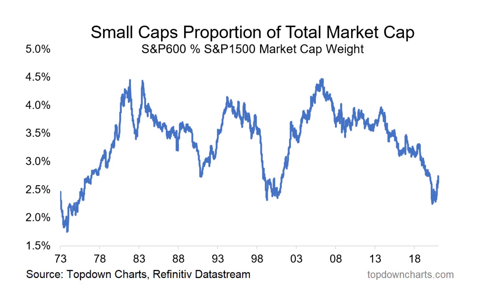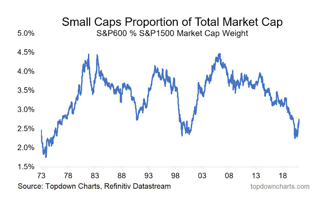 Arguably, the small-cap bull is just getting started. Callum Thomas at Topdown Charts highlighted the weight of the small-cap S&P 600 in the S&P 1500. S&P 600 weight recently made a relative bottom, but it has a long way to go before it even normalizes.