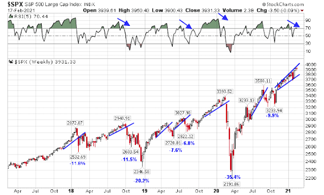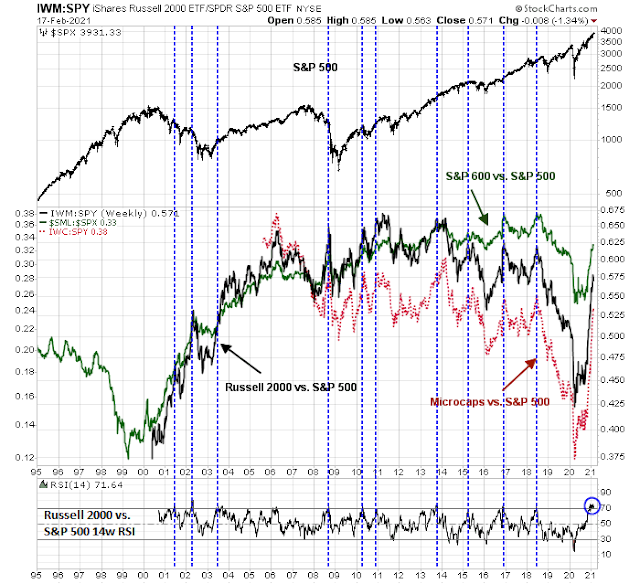 From a longer-term perspective, this chart of small to large-cap ratios makes it clear that we are just starting a relative bull cycle for small-cap stocks. The relative performance of microcaps (IWC), the Russell 2000, and the S&P 600, which has a higher earnings quality because S&P has a stricter inclusion criteria than the Russell indices, also show that the market experienced a quality effect for the past few years. Low-quality small caps began to lag as early as 2015, but they have snapped back in a convincing fashion in the past year. As well, the Russell 2000 to S&P 500 14-week RSI has become overbought, and that has been a signal in the past for a tactical reversal in relative performance.