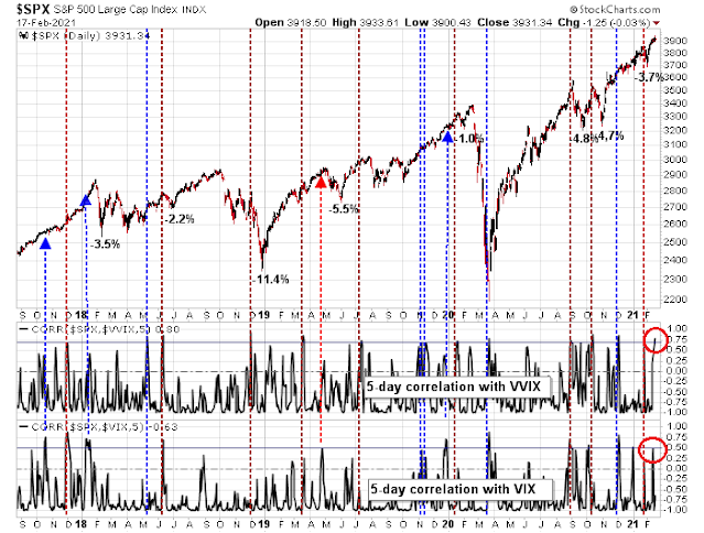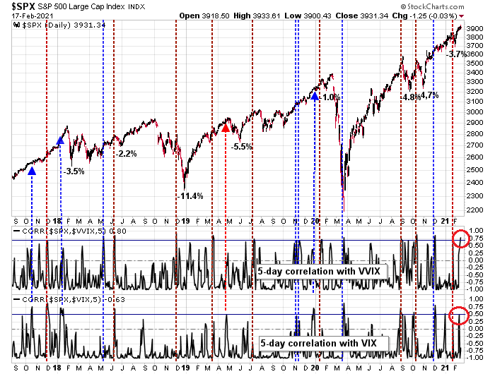 In addition, a technical cautionary signal comes from the rising correlation of the S&P 500 and the VIX Index, and the VVIX, which is the volatility of the VIX. In the past, spikes in correlation have resolved with 3-5% pullbacks.