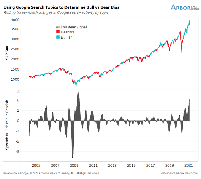 On one hand, bullish sentiment can be interpreted in a bullish way. Arbor Data Science pointed out that the spread between bull and bear searches is extraordinarily high. The last time the readings reached these elevated levels, the market continued to advance. These surges in bullish sentiment is not unusual during the initial phases of a new bull.