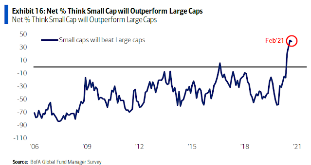 On the other hand, the latest BoA Global Fund Manager Survey shows that institutions are off-the-charts bullish on small cap stocks, which is contrarian bearish.