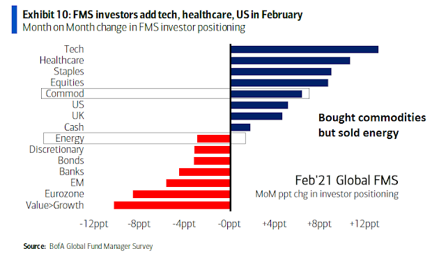 I reiterate my view that commodity bulls should look for contrarian opportunities in energy. While the most recent BoA Global Fund Manager Survey showed an excessively long position in commodities, the monthly change indicated that managers bought commodities but sold energy.