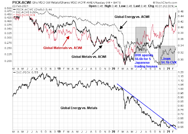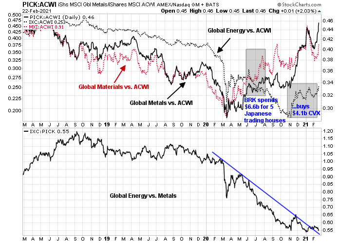 As the chart below shows, the company’s sector bets were timely. Global materials and mining stocks have outperformed the MSCI All-Country World Index (ACWI) since the Japanese purchases were announced. As well, the relative performance of energy stocks appears to be constructive. Global energy is turning up against ACWI, and it is bottoming when compared to the red-hot global mining sector.