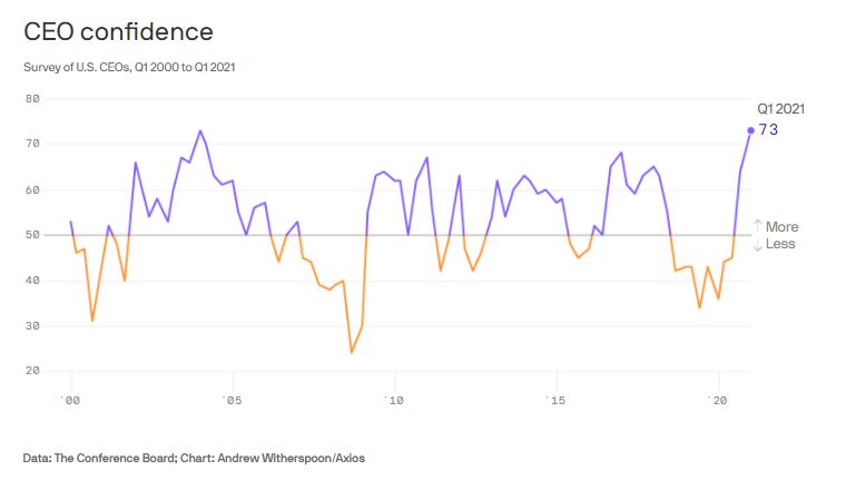 For investors with a 2-3 year horizon, it probably doesn’t matter. The global economy is undergoing a cyclical and reflationary rebound. Conference Board CEO confidence recently reached 17-year highs. Companies are on track to increase their capital spending plans, which translates into high commodity demand.