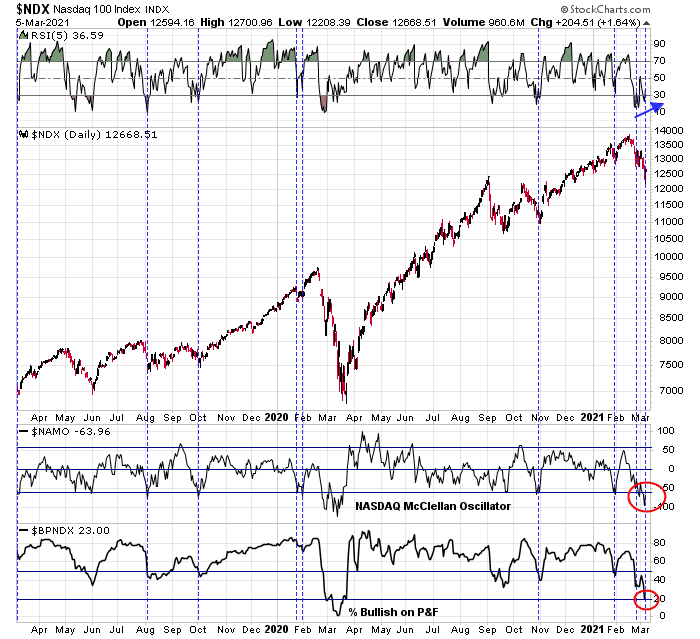The NASDAQ 100, which bore the brunt of the selling, is also exhibiting a positive 5-day RSI divergence. As well, the NASDAQ McClellan Oscillator (NAMO) has reached a second oversold reading in the space of a week. The last time this happened, which was in January 2020, the index bottomed and took off to its ultimate peak in February when the news of the pandemic sideswiped all risk assets. In addition, market breadth such as the percentage of stocks with point and figure buy ratings have reached oversold levels.