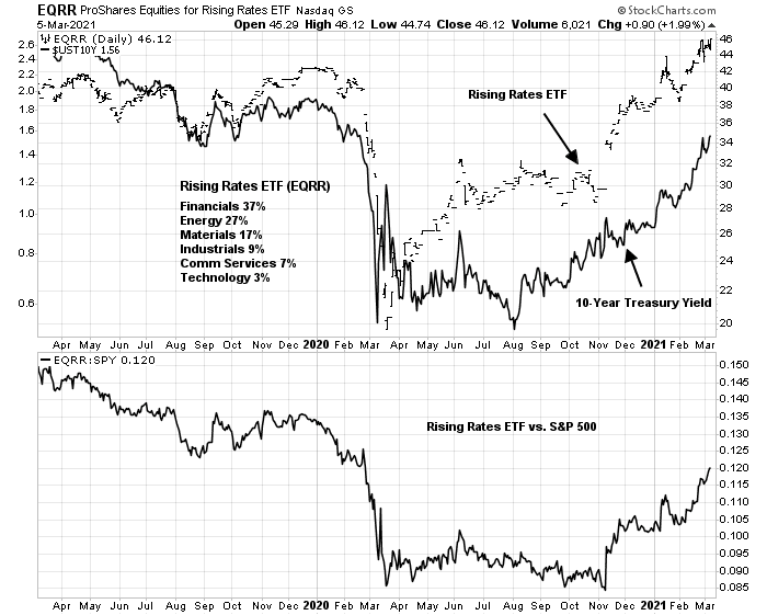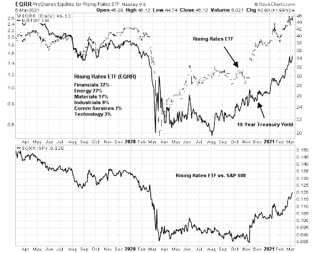 However, market averages are deceptive. Investors should use rallies to raise cash from the sale of growth stocks rotating into value stocks on weakness. Proshares has a Rising Rates ETF (EQRR) that I would not recommend buying because of its minuscule assets and lack of liquidity. Nevertheless, its sector weights are tilted towards value and cyclical sectors and reflective of the new market leadership, and its relative performance is revealing of what investors should expect in the new market regime.