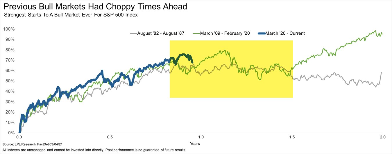 Ryan Detrick of LPL Financial offered the following template for the market. If the current bull market follows the pattern of the two strong bull markets that began in 1982 and 2009, it would begin to tire and consolidate about now.