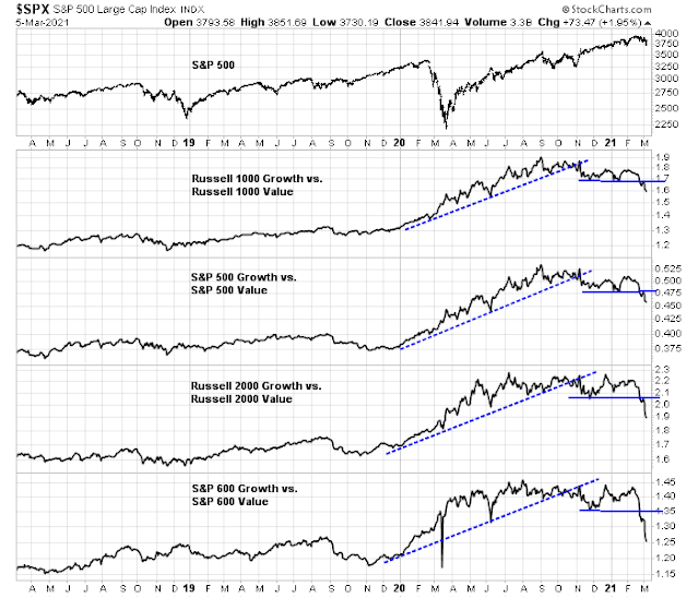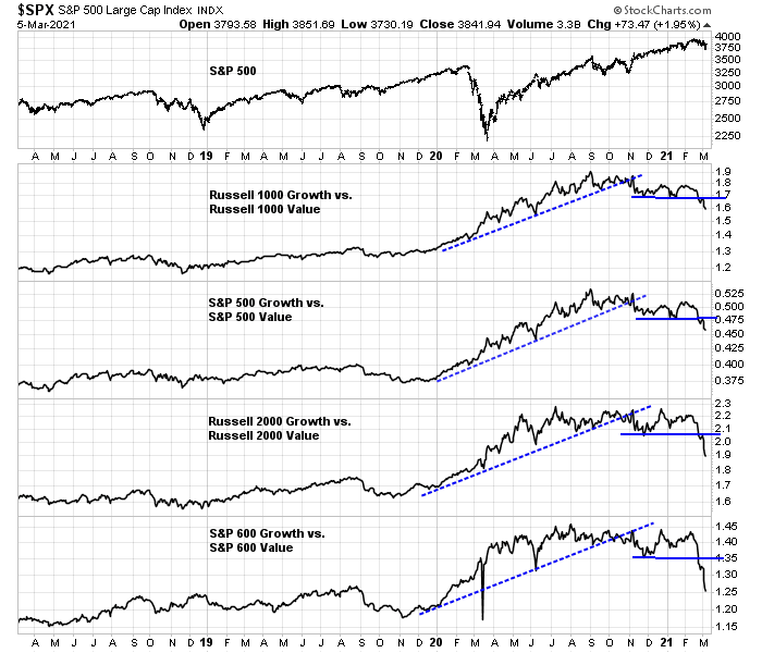The same can be said of growth stocks. For several years, growth stocks have been the market leaders, but the growth and value relationship reached an inflection point at about the time of Vaccine Monday in November when Pfizer announced positive news on its vaccine by trading through a rising relative trend line. The growth to value ratio recently broke down by confirming the dominance of the value style last week.