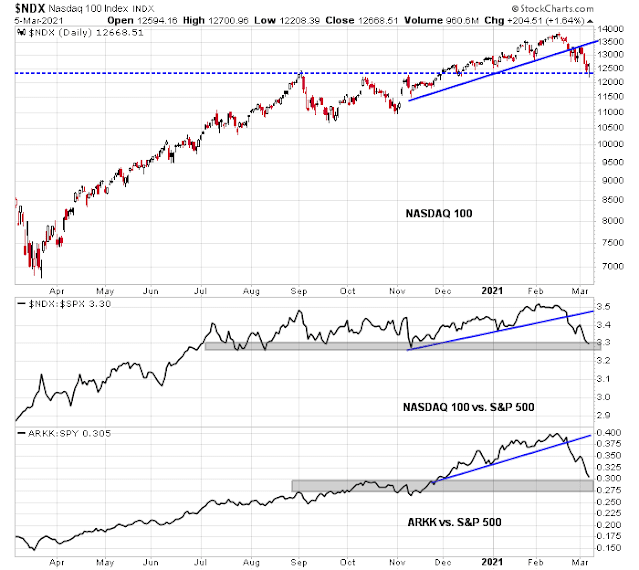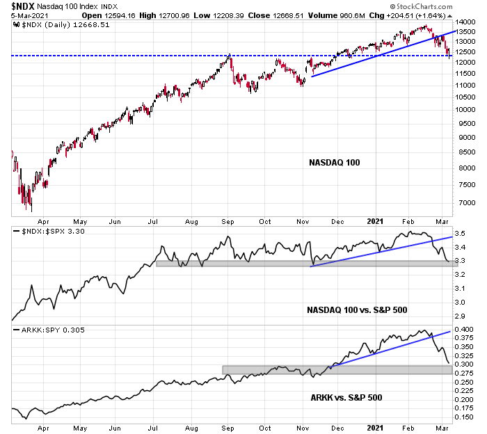 The growth-heavy NASDAQ 100 is rolling over. Its performance relative to the S&P 500 is nosediving, and so is the relative performance of the speculative growth ETF ARKK. However, NDX and ARKK are all trading at or near absolute and relative support.