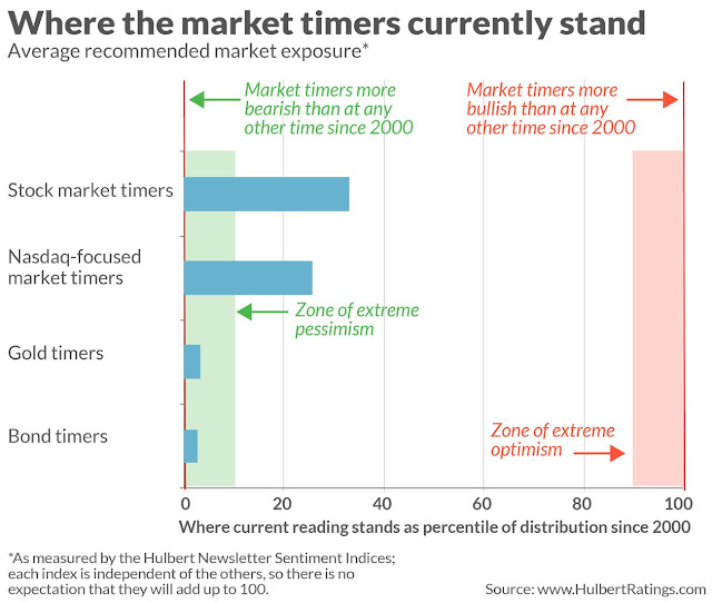 Mark Hulbert‘s newsletter sentiment models show that while equity sentiment is low, they are not in the extreme pessimism zone. However, gold and bonds are washed out and poised for rallies.