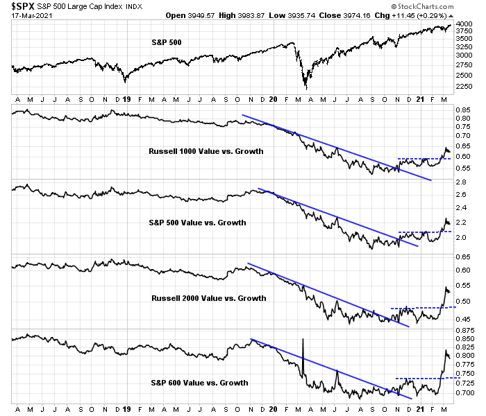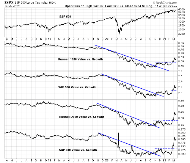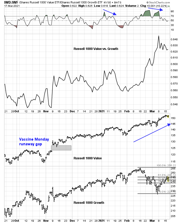 This chart of the Russell 1000 Value to Russell 1000 Growth ratio tells the story. After value stocks opened a “Vaccine Monday” runaway gap last November, value stocks have made their way higher against growth stocks. The ratio became extended and exhibited a negative 5-day RSI divergence in early January. Both value and growth stocks proceeded to pull back, with value the underperformer. The ratio exhibited another negative RSI divergence in early March. This time, growth stocks rallied with a vengeance while value stocks were mostly flat. The Russell 1000 Growth Index skidded but recovered and its advance is currently testing technical resistance defined by the 61.8% Fibonacci retracement level.