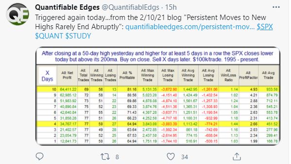 Quantifiable Edges pointed out after yesterday’s close that the market had pulled back after exhibiting a strong run, indicating a bullish setup for further gains.