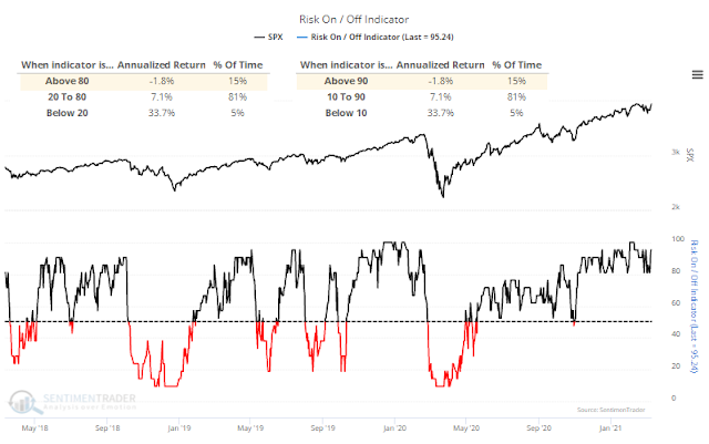 SentimenTrader observed that “Investors are nearing a record in Risk-On behavior”.