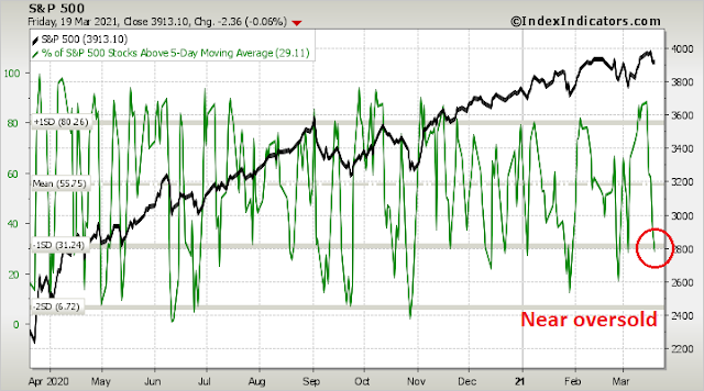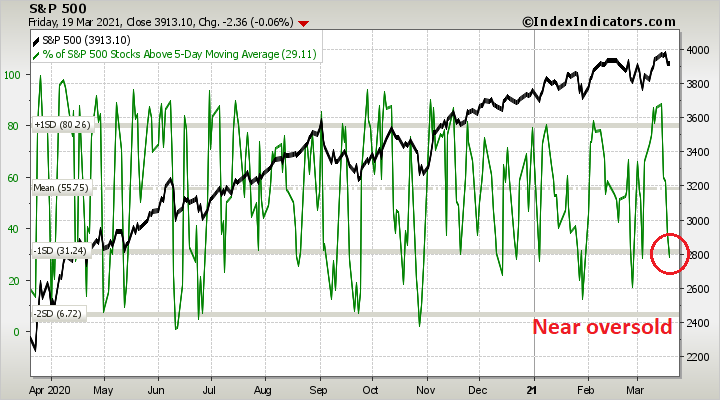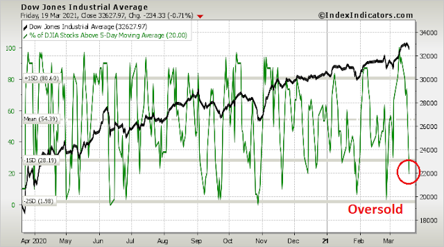 Short-term breadth for the DJIA. which as a proxy for value and cyclical stocks, are flashing a similar oversold reading. Expect market strength during the first half of the week.