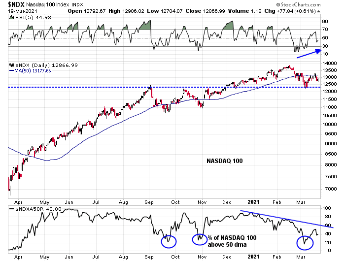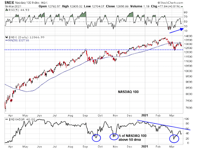 NDX bounced off an area of major support while exhibiting a positive 5-day RSI divergence in early March. The index was also oversold as measured by the percentage of stocks above their 50 dma. The rally met but couldn’t overcome overhead resistance at its 50 dma and the index has since pulled back.