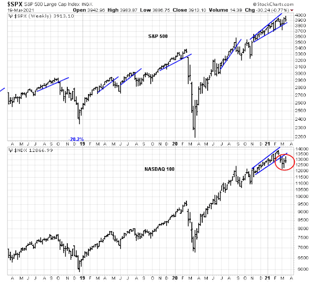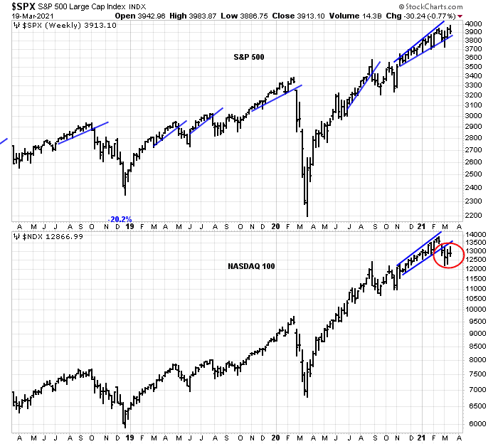 The weekly chart of the S&P 500 shows that it survived a brief corrective scare, but the index went on to fresh highs. By contrast, the growth-heavy NASDAQ 100 is acting like a sick puppy. NDX violated a rising trend line and last week’s rally attempt was rejected at the 50 dma level.