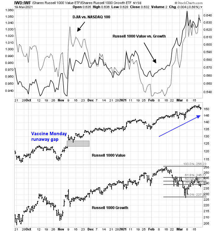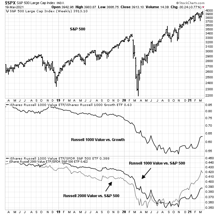 When bull market cycles mature and end, market leadership changes. This is evident with the behavior of value and growth stocks, which I have called the Great Rotation. Growth had been leading for years, but value bottomed out against growth last summer and began to turn up in late 2020. The effects of the Great Rotation can be seen by the relative strength of the Russell 1000 Value Index (large-cap value) against the S&P 500 (bottom panel). The performance turnaround of small-cap value, as measured by the Russell 2000 Value Index, was even more dramatic.