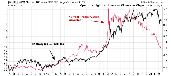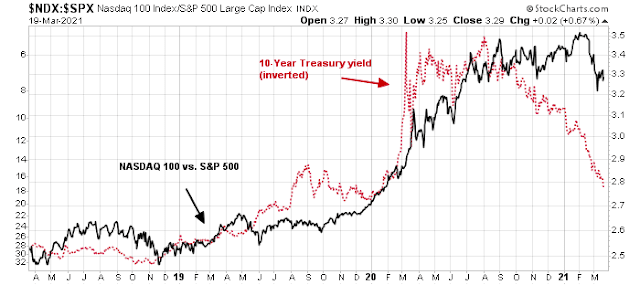 On the other hand, the relative performance of NDX is inversely correlated to bond yields. The 10-year Treasury yield has surged above 1.7%, which has to put downward pressure on the attractiveness of growth stocks.