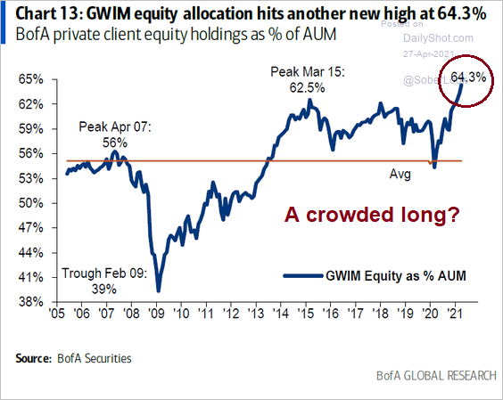 Sell signals have failed. Much of this can be explained. Some, like this sentiment signal from BoA’s private client holdings, indicate a record crowded long in equities which is contrarian bearish. However, how much can investors allocate to fixed-income instruments in an era of low and rising rates? Stocks are the only game in town, even for income investors.