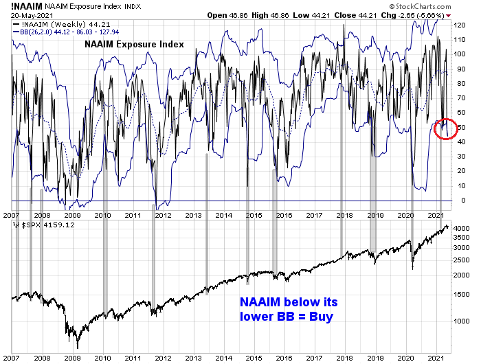 The market is also on a NAAIM buy signal. The NAAIM Exposure Index measures the opinions of RIAs who manage individual clients’ portfolios. In the past, a decline of this index below its 26-week Bollinger Band has been a reliable buy signal that indicates low downside risk.