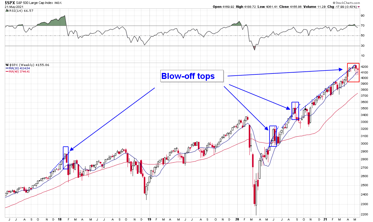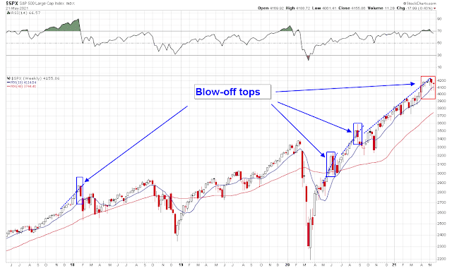 I have been writing about the possibility of a blow-off top ever since the S&P 500 rose above its rising trend line (see A blow-off top ahead?). In the past, blow-off top episodes were characterized by a spike upwards in one week, followed by a precipitous drop the next week.