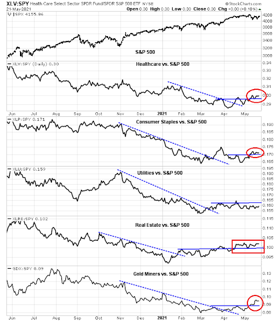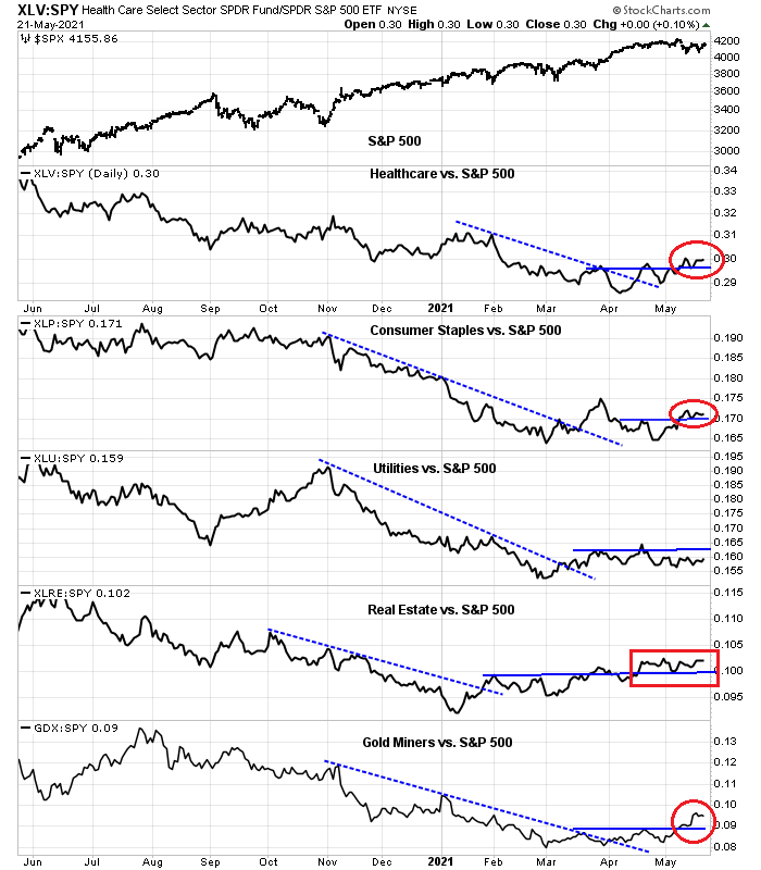 On the other hand, the bears also have a case for unfinished business to the downside. Despite the stock market rally, the relative performance of most defensive sectors remain above their relative support levels. This is an indication that the bears haven’t lost control of the tape.