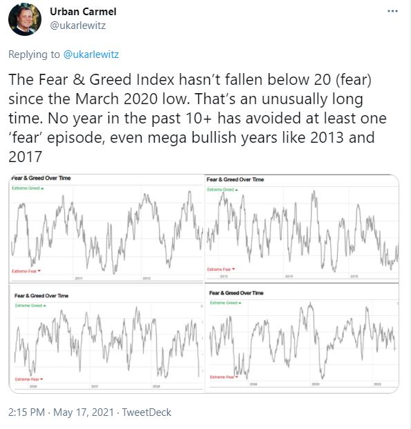 Urban Carmel pointed out that the market is overdue for a pullback and fear spike. The Fear & Greed Index hasn’t fallen below 20 since the March 2020 low, which is an unusual condition.