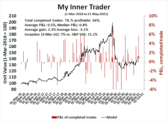 My inner trader uses a trading model, which is a blend of price momentum (is the Trend Model becoming more bullish, or bearish?) and overbought/oversold extremes (don’t buy if the trend is overbought, and vice versa). Subscribers receive real-time alerts of model changes, and a hypothetical trading record of the email alerts is updated weekly here. The hypothetical trading record of the trading model of the real-time alerts that began in March 2016 is shown below.