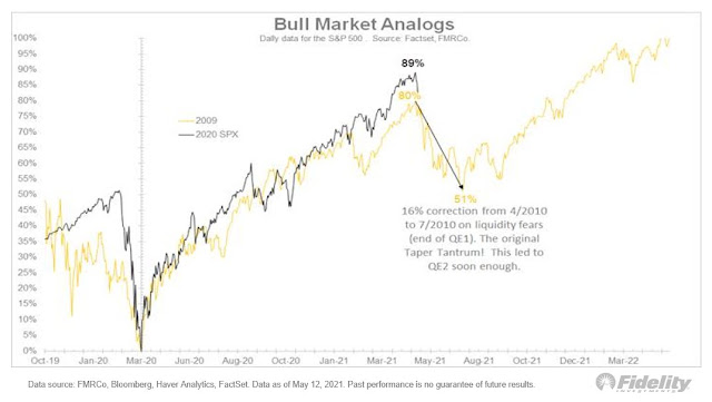 What’s the verdict, bull or bear? Jurrien Timmer at Fidelity has compared the trajectory of the stock market recovery to the market surge in the wake of the 2009 bottom. If the market were to follow the same path, the S&P 500 is due for a 16% correction.