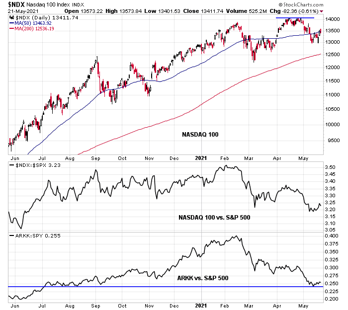 The NASDAQ 100, which was one of the worst-hit parts of the market, exhibited a positive RSI divergence. It has since rebounded and trying to regain its 50 dma. As well, the high-octane ARK Innovation ETF bounced off a relative support level against the S&P 500 and it recovering.