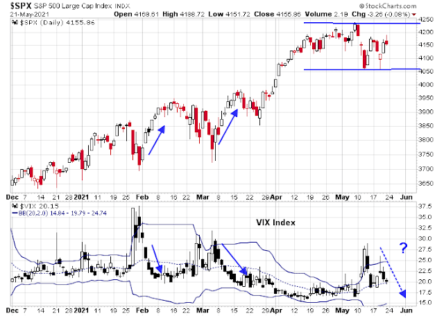 On the other hand, if the VIX maintains support at its 20 dma, expect a sideways choppy market and a possible retest of the S&P 500 50 dma.
