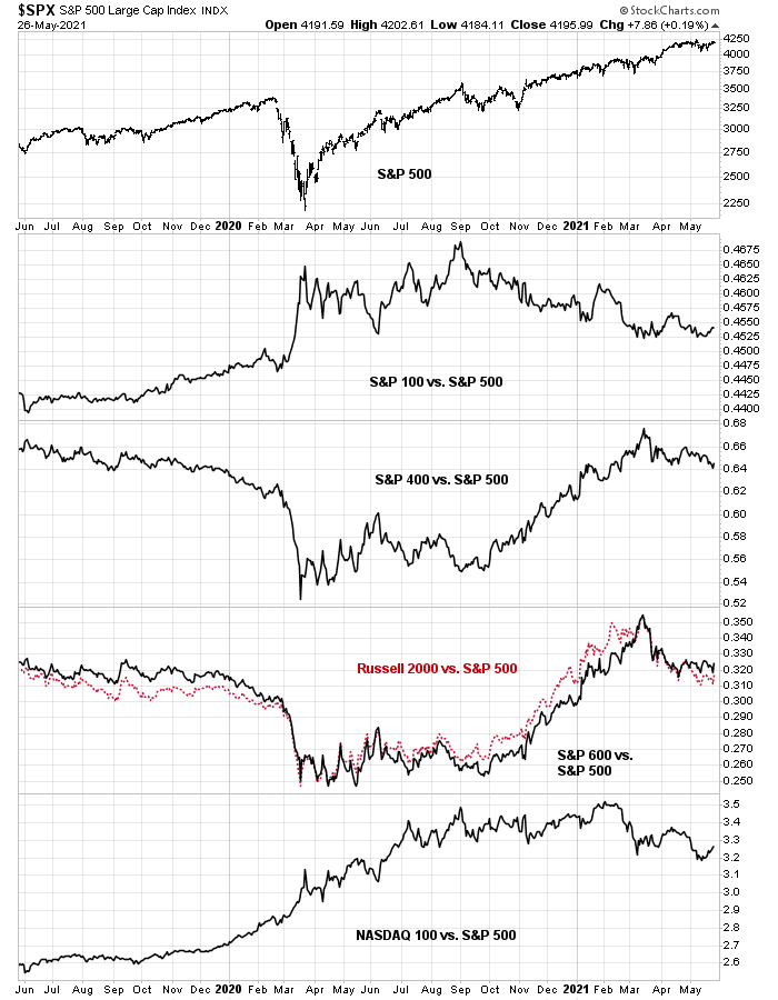 Similarly, the relative performance of the market by market cap grouping also shows a picture of uncertain leadership. Mid and small-caps are in relative downtrends, while mega-caps and the NASDAQ 100 had been in relative downtrends, but trying to recover.