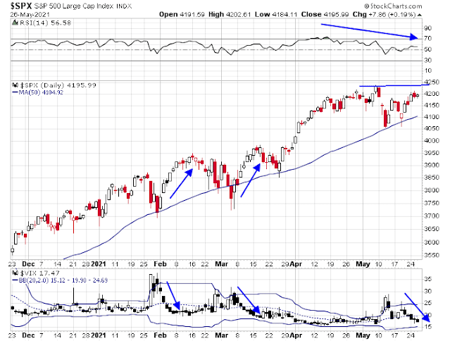 The stock market is acting like it’s due for a pause in its bullish impulse. I have highlighted this chart before. Market breadth, as defined by the percentage of S&P 500 above their 200 dma, has risen above 90%. In the past, this has been a sign of strong price momentum that accompanies a strong bull move (grey shaded areas). However, the advance has paused when the 14-week RSI recycled from an overbought condition, which it did recently.