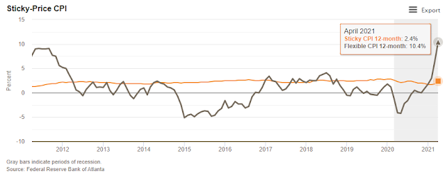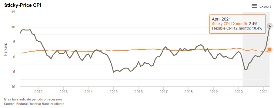 For Fed policymakers, the issue is whether these wage pressures indicate the start of a cycle of cost-push inflation. For the time being, they will regard these pressures as transitory unless proven otherwise. The Atlanta Fed’s Core Sticky-Price CPI, which is “a weighted basket of items that change price relatively slowly”, has been steady throughout the pandemic. By contrast, the Flexible CPI, which is “a weighted basket of items that change price relatively frequently”, has skyrocketed.