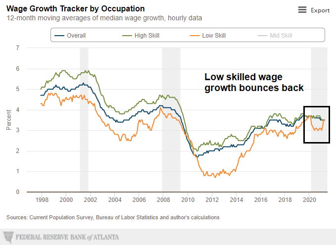 The Atlanta Fed’s Wage Growth Tracker sheds some light on this problem. Wage growth among low-skilled workers plummeted upon the onset of the recession, though high-skilled wage increases remained steady. As the economy reopened, low-skilled wage growth snapped back.