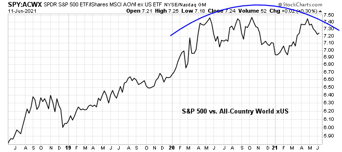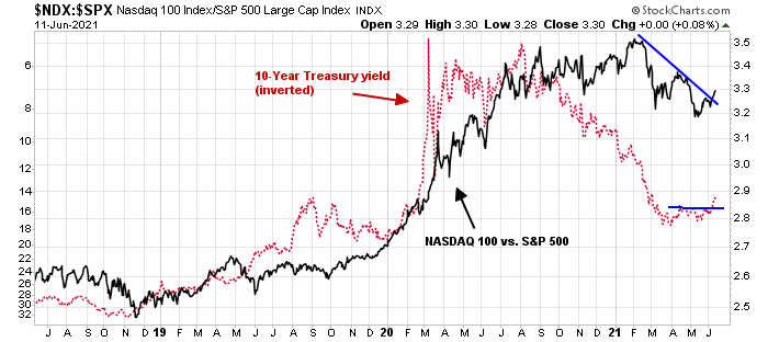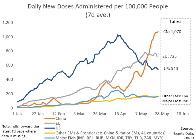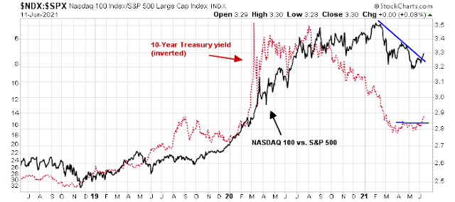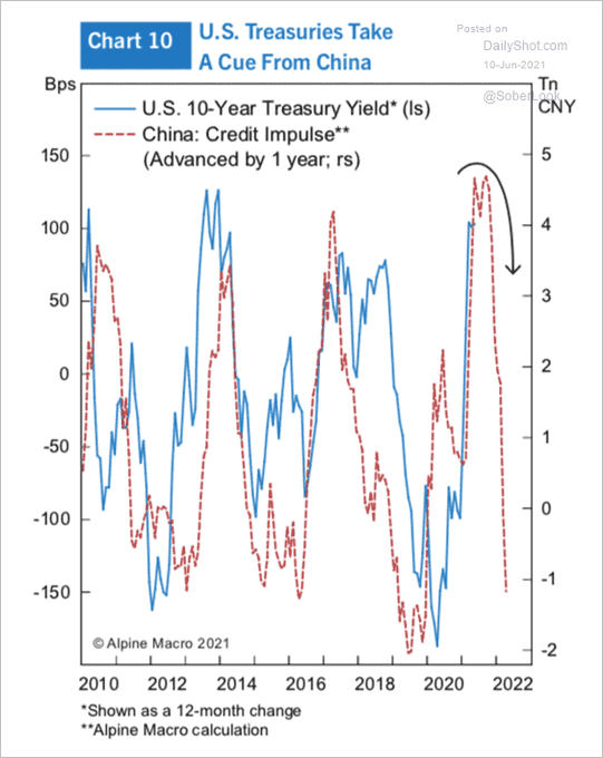 In the meantime, the bond market is buying into the Fed’s narrative of “transitory inflation” and yields are falling. As I pointed out in my May 29, 2021 note (see