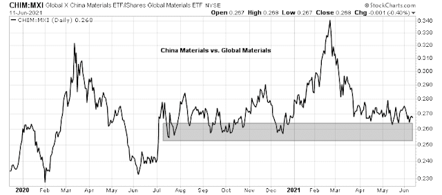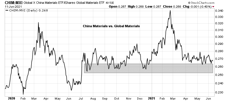 More importantly, Chinese material stocks are bottoming against global materials. I interpret this as an indication that the growth deceleration is over.