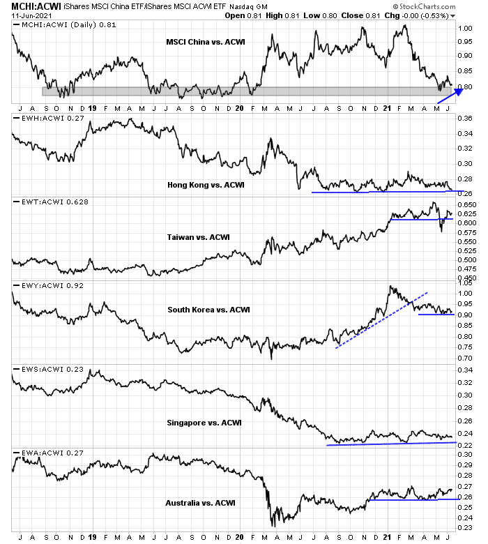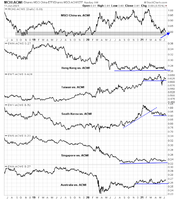 Over in Asia, the bleeding in China and China-related plays appears to have stopped despite signs of Chinese growth deceleration. Chinese stocks and the markets of her major Asian trading partners are all bottoming relative to ACWI. Selected markets like Taiwan and Australia are exhibiting some signs of relative strength.