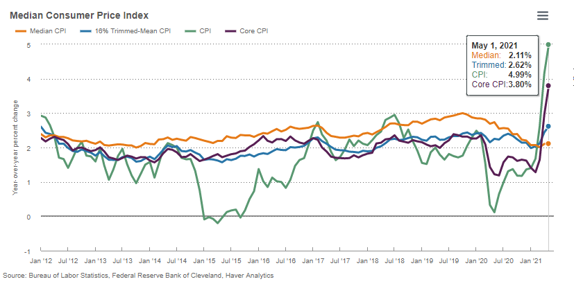 Ahead of next week’s June FOMC meeting, here is what Fed policymakers are seeing on their inflation dashboard. Headline and Core CPI have spiked, but more detailed analysis shows that price increases were attributable to transitory factors. The Cleveland Fed’s median CPI remains tame, indicating that price increases were attributable to outlying noise.