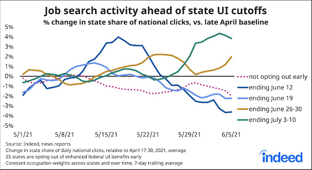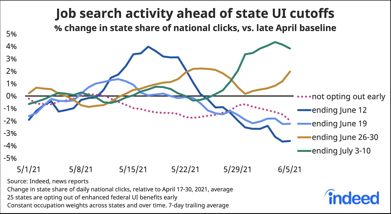 Could government support be encouraging workers to stay home? Will the economy see a flood of new workers flood the market when job benefits expire? The preliminary answer is no. Indeed tracked the job search activity of states that are cutting enhanced unemployment benefits on June 12. Job searches in these states have not picked up. In fact, they are below the national average.