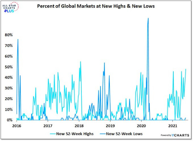 Willie Delwiche observed a marked difference between industry breadth in the US and abroad. The percentage of US industries making new highs has been declining.