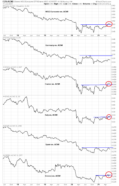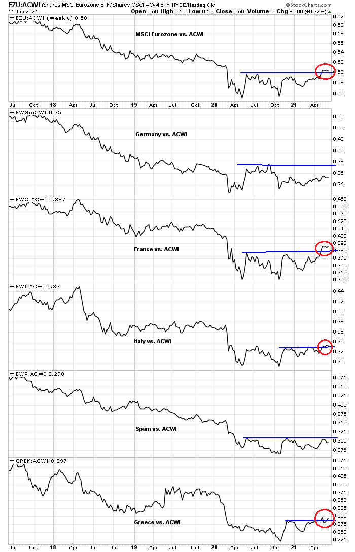 I believe the rotation is attributable to the wage pressures in the US, which will squeeze margins and the expectation that economic growth differentials between the US and Europe will narrow. Eurozone equities have staged a relative upside breakout against ACWI, with strength coming from France, Italy, and Greece. The most notable laggard is Germany.