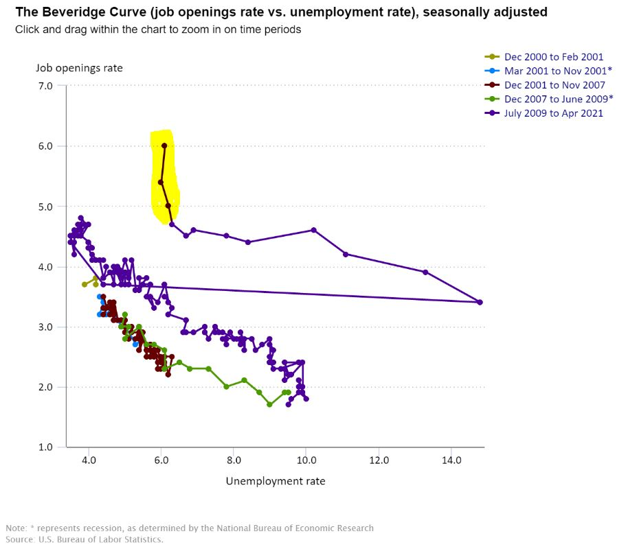 As you can see here on the chart from the BLS, job openings are soaring (see the highlighted part) while the unemployment rate holds steady.