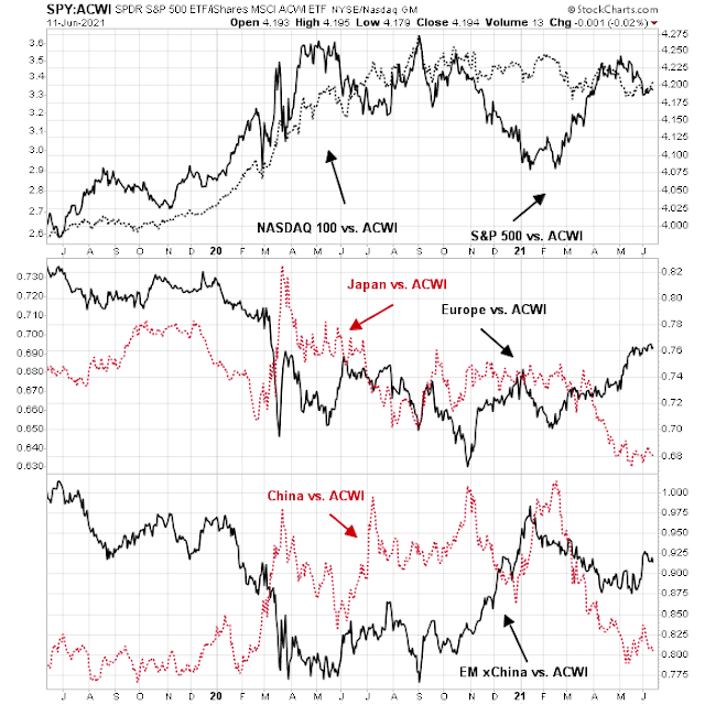 In addition, investors are rotating out of US equities. Here is a closer look at the relative performance of the major regions against MSCI All-Country World Index (ACWI). As US equities falter, Europe has caught a bid. Even Japan is turning up, and so are emerging markets, especially outside China.