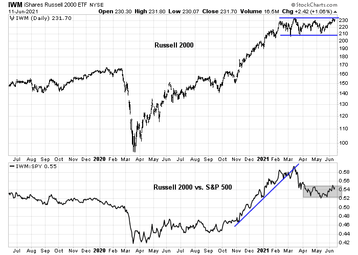 The small-cap Russell 2000 continues to languish in a trading range. As well, small-caps have violated a relative uptrend and they are now trading sideways against the S&P 500.