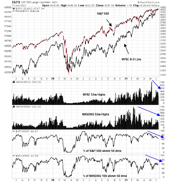 While it is said that there is nothing more bullish than fresh highs, most market internals are not confirming the stock market’s strength. While the NYSE Advance-Decline Line did advance to fresh highs, both NYSE and NASDAQ new 52-week highs are weakening. So are the percentage of S&P 500 and NASDAQ stocks above their 50 dma.